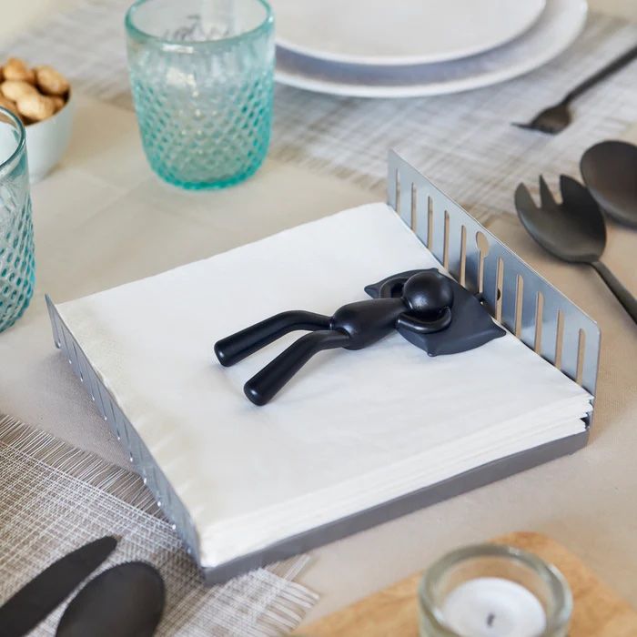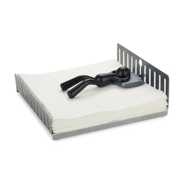 A charming figure, snoozing peacefully on your neatly folded napkins. This delightful napkin holder not only adds a touch of whimsy to your dining room, but also serves as a reliable anchor to keep your napkins in place