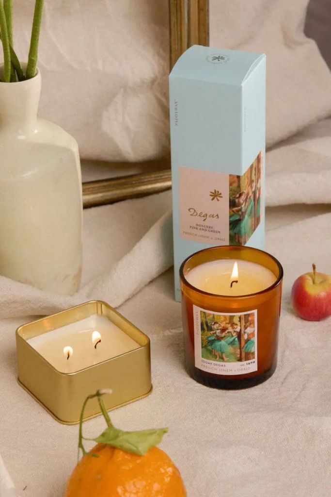 Per tutti gli amanti dell'arte, la collezione di candele e diffusori a bastoncini è impreziosita da opere d'arte impressioniste di cinque rinomati artisti. Ogni serie, che include una candela in latta con decoro a rilievo, una candela in vetro ambrato e un diffusore a bastoncini abbinato, reca la firma dell'artista e contiene fragranze ispirate all'essenza del capolavoro. Le scatole in latta sono perfette come regalo di Natale e le scatole facilitano l'incartamento dei regali!